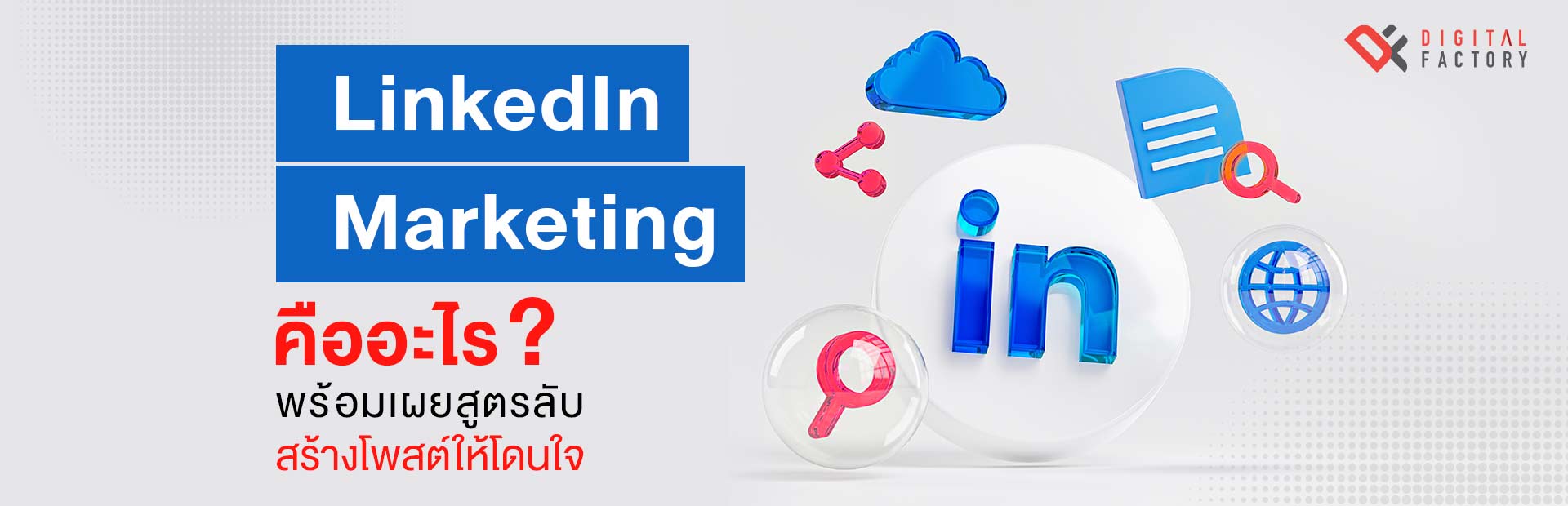 LinkedIn Marketing คือ การทำการตลาดบนแพลตฟอร์ม LinkedIn ที่เน้นเจาะกลุ่มเป้าหมายวัยทำงาน หรือธุรกิจอื่น ๆ เช่น การสร้างโปรไฟล์เพื่อแนะนำธุรกิจของคุณให้ผู้คนรู้จัก การเขียนบทความ การเข้าร่วมกลุ่มต่าง ๆ ซึ่งในมุมธุรกิจ LinkedIn จะช่วยเพิ่มความน่าเชื่อถือให้แก่ธุรกิจของคุณยิ่งขึ้น นอกจากนี้ LinkedIn ยังสามารถทำการตลาดผ่านการยิง Ads ได้เช่นเดียวกับแพลตฟอร์มออนไลน์อื่น ๆ